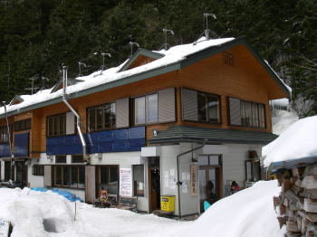 | 夏沢鉱泉。冬期営業を始めて今年が2年目の新しい小屋だ。新しい小屋らしく、屋根には発電用の風車、外壁にはソーラーパネルが付いているが、現在は沢の水による水力発電で電力は間に合っていて使っていないそうだ。 小屋に到着してから夕食までにはだいぶ時間があったので、風呂に入ったり、酒盛りとおしゃべりでのんびりと過ごす。 |