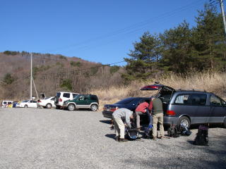 | 深田記念公園の側にある登山口の駐車場。8時半過ぎに到着したときには既に10台ほど止まっていた。歩く身支度をしている間にも続々と車が入ってきた。 |