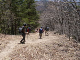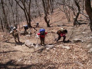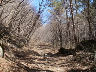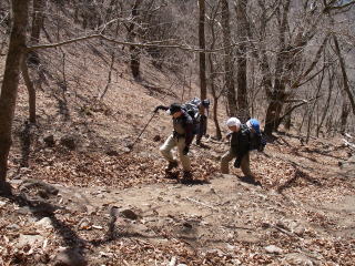 | 女岩からは急な登り。道はカラカラに乾き、落ち葉で埋まっているところも多い。 |