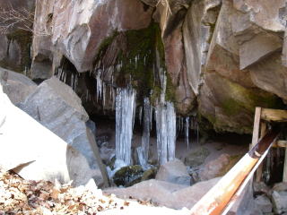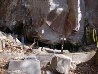 | 登山道の幅が狭くなると間もなく女岩に。茅ヶ岳唯一の水場だそうだ。樋で引かれた水を飲むことができる。側に置かれたガラスのコップは日向にあるのに岩に凍り付いていた。気温はまだ氷点下のようだ。 |