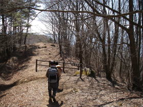 | 下山は尾根道コースを取ることにした。山頂付近は急な道で、千本桜公園の分岐を左に取り、しばらく下ると尾根筋の防火帯につけられた道になる。 |