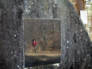 | 深田記念公園にある『百の頂に 百の喜びあり』の碑 碑の表面が鏡面仕上げになっていてうまく写真を撮れない。暗くなってから正反射が入らない位置からフラッシュ撮影でもしないとだめそう。 |