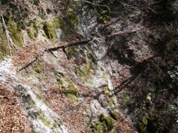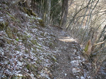 | その後も次々と崩落地が現れる。木の橋が谷に落ちてしまっているところもある。朽ちた丸太の橋に霜や雪が薄く乗り、滑りそうで恐る恐る渡った所もあった。 |