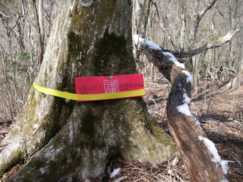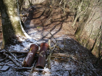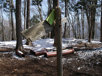 | 権現山の山頂がだいぶ近くなった所に畦ヶ丸への道らしい分岐があった。誤って入り込むのを防ぐためか、道を塞ぐように木が置かれ、×印をつけた土管が置いてある。その先には畦ヶ丸が樹間に見えるので、ここから畦ヶ丸に行くらしい。でもまずは権現山を目指す。 |