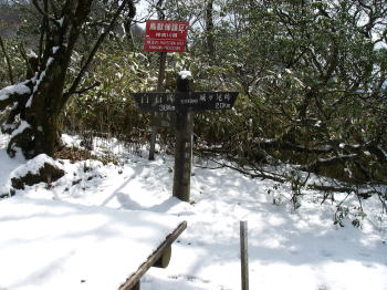 | 『畦が丸へ 放浪尾根経由』と書いてある道標。 ここを過ぎて山頂が近づくとクマザサの藪漕ぎになった。クマザサには雪が付いていて、それがどんどん融けている状態だったので雨の中の藪漕ぎのようにびしょ濡れになった。 藪漕ぎといっても地面には登山道がはっきり付いているので登山道を外れる心配は全くない。 |