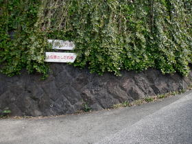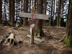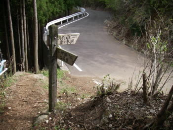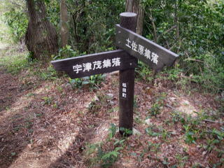 | 細い道にはいると道標は宇津茂集落を指すようになり、鍋割山とは書いてないので、ちょっと心配になる。そのまま進むと宇津茂集落を右に分けるところに鍋割山という道標が現れた。 |