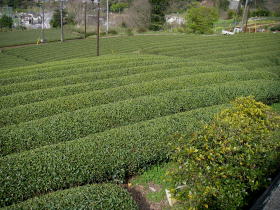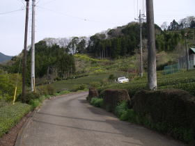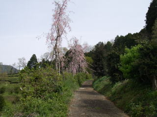 | 土佐原のしだれ桜を過ぎると間もなく茶畑脇の細い道になる。 |