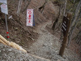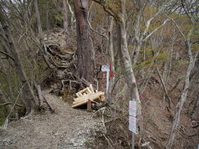 | 後沢乗越。これから先は歩いたことのある道だ。だが二俣への道は伐採搬出作業中につき通行止になっていた。 |