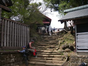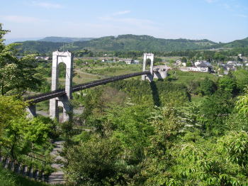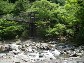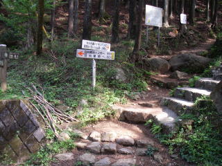 | この後林道に出て大山の登山口に向かったが、林道はヘアピン状に曲がっていて、10分ほど歩くと渡渉の時見上げた吊り橋の入口に出た。吊り橋を渡れば10分ほど節約できたのに後の祭りだ。地図を見るとちゃんと吊り橋を渡るルートが書いてあった。地図で確認してから行動するのではなく、困ってからあるいは変だと思ってから地図を見る。悪い癖だ。 |