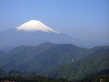 | 三ノ塔の山頂から見る富士山。よく見えると清々しい。 山頂では富士を眺めながら食糧補給をしてこれから歩くヨモギ尾根に備えた。 三ノ塔に登る途中も、ちょっと涼しい風が心地よく吹き、薫風ということばを思い出しながら歩いた。 |