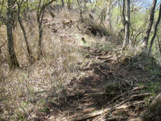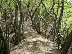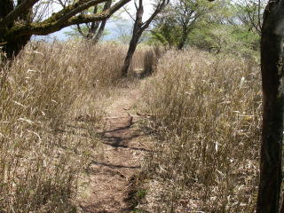 | 左に折れて烏尾山に向かう地点をほぼ直進してヨモギ尾根に入るところの道。拍子抜けするほどはっきりした道だ。 |