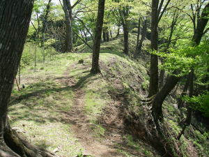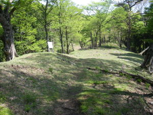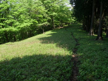 | ヨモギ平のちょっと先で鹿柵を越えた後も少し草地が続くが、直ぐに檜の人工林になる。檜の林の中は落ち葉が堆積していて踏み跡が分かりにくいところがあるが、迷うような所はなかった。 人工林の縁には右のような草地があり、日の差し込まない人工林の中を歩くより気持ちがいい。 |