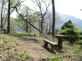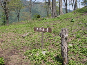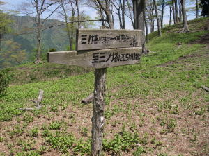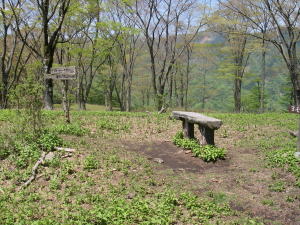 | ヨモギ平。広々とした新緑の草地。道標には、三ノ塔まで1時間、札掛まで40分と書いてあった。ベンチは三つあり、右の写真の二つのベンチの側を通る道がはっきりと付いていたので、この道を進むとすぐに尾根から離れ、大山の方向に下りはじめた。これはおかしいと思い道標まで戻り尾根筋を辿り札掛に向かった。5分程のロス。 |