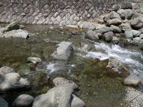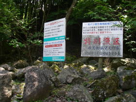 | ヨモギ尾根の道は藤熊川とタライ小屋沢の合流点まで続き、この看板の裏側に出る。近くに吊り橋があり、釣り人も大勢いた。近くをさがせば石づたいに飛んで渡渉できそうだったが、沢に下りた地点で裸足になって渡った。釣り人が近くにいたし、吊り橋の上には見物人もいたので無理をしてつるり、ザブンは避けたかった。 |