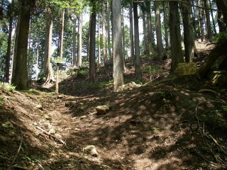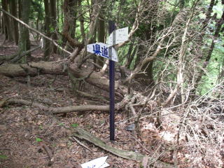 | 札掛の大山登山口。登り始めると直ぐ道は枝打ちされた枝で埋まっていて歩けない。無理に進むと最近大がかりな伐採が行われたようで登山道がなくなっていた。尾根筋を外さないように歩きやすそうな所を登ること1km弱ほど、やっと登山道が現れた。 |