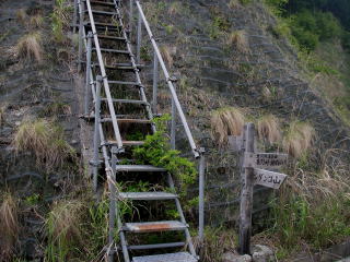 | シダンゴ山の手前で道はこの階段で林道に下り、横断する。ここは宮地山への分岐にもなっている。 |