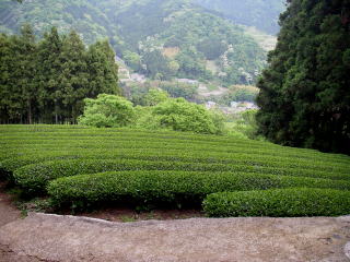 | 鹿柵ならぬイノシシ柵を抜けて舗装道路に出たところにある茶畑。新緑が美しい。 |