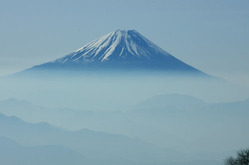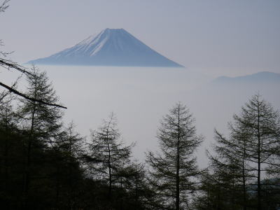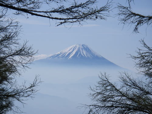 | 帰路、櫛形山山頂から木の隙間を見つけて撮った富士山 |