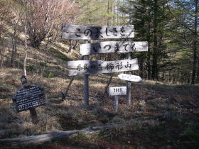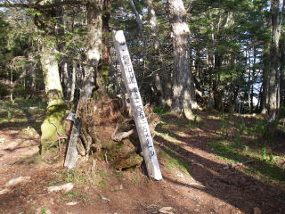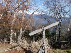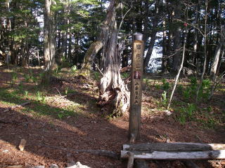 | 櫛形山山頂。周囲を樹林に囲まれ展望はないが樹間から白い南アルプスの山があることは確認できる。この写真の櫛形山は2.5万図の櫛形山から北の方に500m程離れたところにある。2.5万図の櫛形山の位置には山頂を示す道標はなく、コースタイムも取らずに通過してしまった。 |