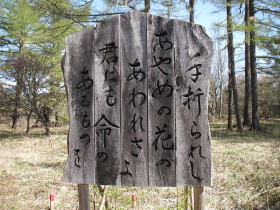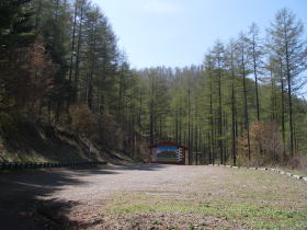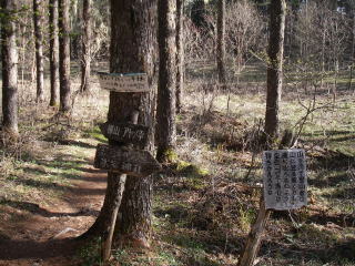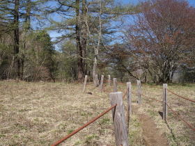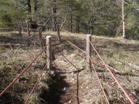| 裸山の入口。入口からは両側にロープを張った登山道が裸山の山頂を通るループになるように付けられていた。時期になればアヤメがたくさん咲くところなので踏み荒らされないようにするためだろう。 |