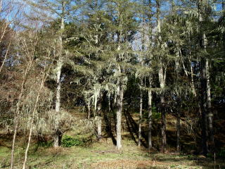 | 山頂から5分程歩いたところにある、ほこらキャンプ場への分岐とその近くにある草原の周囲にあるサルオガセのかかった木。いかにも原生林、深山といった雰囲気。この辺りから裸山の登りにかかるまでの道はほぼ平坦な原生林の道。 |