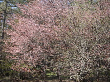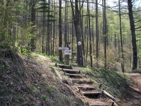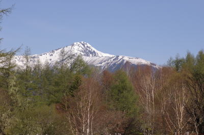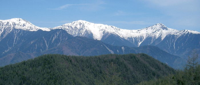 | まだ花の時期には早く、静かな原生林の遊歩道歩きといったところです。花はまだでも芽吹きははじまっていて、新緑を楽しみました。コースのほとんどは樹林の中ですが、林の切れ目から白く輝く南アルプスの山々が見える所があり、素晴らしい眺めに得をした気分です。 |