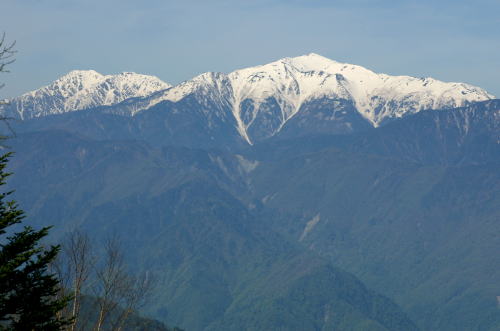 | 裸山山頂。樹間には南アルプスの山が見える。 |