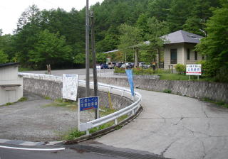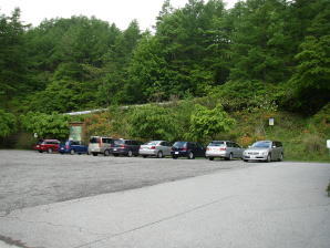 | 柳沢峠の市営駐車場とトイレ。ウイークデイの8時前に到着したのにもうこれだけ車が止まっていた。三窪高原のツツジを目当てに訪ねる人も多いのだろう。駐車場脇の斜面にもツツジが咲いていた。 |