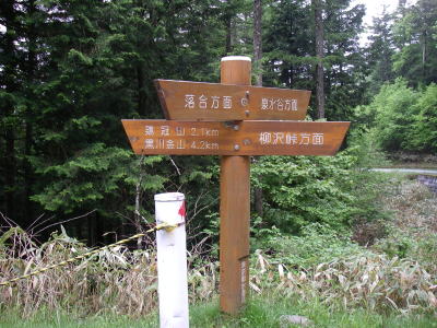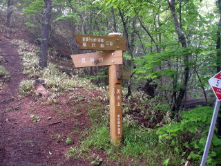 | 横手山峠。ここに鶏冠山と黒川金山の分岐の道標があり黒川山へは鶏冠山の方に行くように添え書きがあった。 |