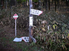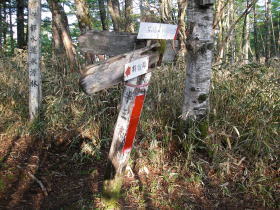 | 山ノ神土の道標。和名倉山の方に一歩踏み出すと笹藪の細い道になりこの先のルートが思いやられる。 |