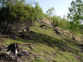 | 東仙波の北斜面を下った辺りから、和名倉山の山頂付近までのあちこちで伐採のあとが見られた。こういったところから伐採した木材が日本人の生活を支えていた時代があったのだと思ったり、放置された太い鋼索を見るとどんな方法で運び上げたのだろうかなどと考えてしまった。 |