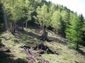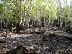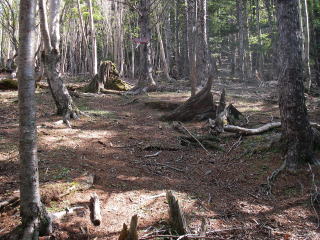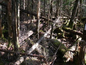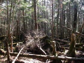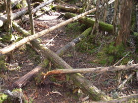 | 山頂の広場の周りは密生した木と倒木の山だ。 |