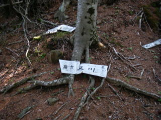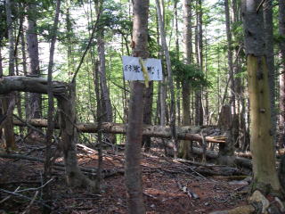 | 山頂のカバアノ頭の方向にはこの尾根は通行できません書いたプレートがあり、近づかないと分からないような細い紐が張ってあった。 |