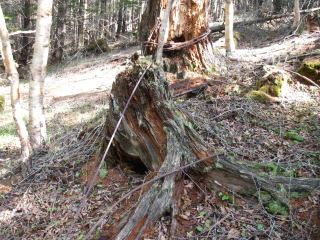 | 東仙波から和名倉山の間には随分昔に伐採した木の切り株が朽ちているところがたくさんある。木材の搬出に使ったと思われる鋼索もあちこちに放置されていた。切り株の朽ち具合からだいぶ時間が経っているようだが、ほとんど植生の回復が進んでいないような所も多く、痛ましい。 |