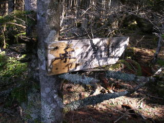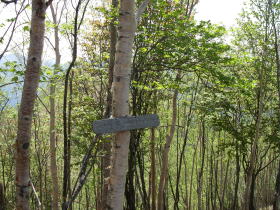 | 山頂まであと3分の道標。二瀬分岐からこの辺りまでもずっと伐採のあとのようだ。 |