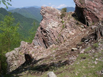 | 帰路、吹上ノ頭付近で形が珍しいので撮った岩。この付近には道の脇が岩場になっているところがあり、ほぼ垂直に近い岩壁にイワカガミが密生しているところがあった。その付近以外ではイワカガミを見かけなかった。 |