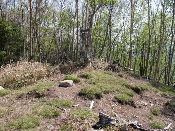 | 和名倉山山頂。山頂は伐採を免れたが樹木が密生し、倒木が積み重なっているといった感じだ。山頂だけは倒木を片付け小さな広場になっている。 |