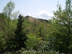 | 樹間から見える、南斜面が笹原の東仙波。この辺りには南斜面だけが笹原になっている山が多い。 |