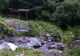 | 西沢渡の荷物渡し篭。激しい水流で渡渉できそうもないのでザックを背負ったまま乗り、対岸へ。こういうのを『野猿』というというかすかな記憶があり、帰宅後調べてみると奈良県十津川村にはこれと似た物があり野猿というそうだ。基本的な構造は同じようだ。 |