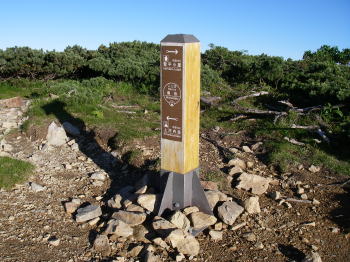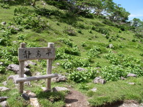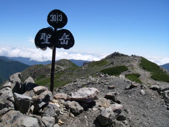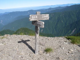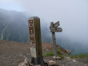 | 西沢渡から薊畑分岐に至る道は、地形が急なところはジグザグになっているので重い荷物をしょっていても比較的楽に歩ける。薊畑はまだ先だと思いながら歩いていると樹林帯を抜けお花畑になった。花の写真を撮ろうかと思いながら顔を上げると間近に薊畑の道標が見えた。 意外に早く薊畑に着いたのに驚く。天気は回復傾向にあり、時間もありそうなので予定を変更して聖岳に行くことにする。早速サブザックに雨具などを入れ、大きな荷物にはザックカバーを掛けて置いておき聖岳に向かう。 |