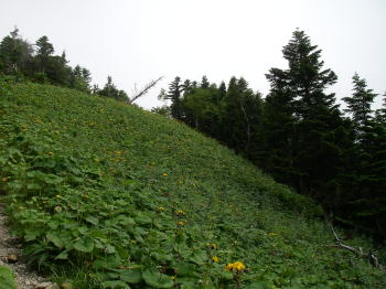 | 薊畑からはお花畑の道で、マルバダケブキが一面に咲いていた |