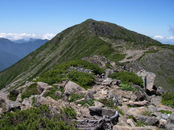 | 聖岳山頂から見る奥聖岳(中央左の小ピーク)。この後、奥聖岳に向かう。 |