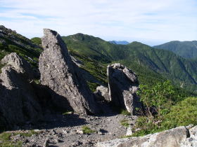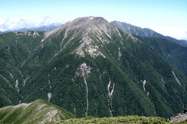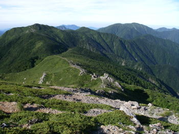 | 上河内岳から振り返ると聖岳、兎岳がくっきりと |