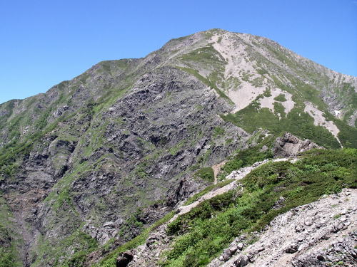 | 小聖岳からは聖岳がくっきりと。サブザックに日焼け止めクリームを入れ忘れたのを悔やむほどの天気になった。 |