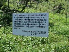 | シカの食害で無くなってしまったニッコウキスゲの群落の再生実験をやっている柵で囲まれた草地が薊畑分岐をちょっと下った所にあった |