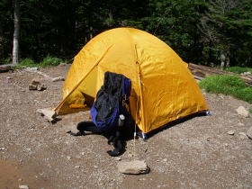 | テントを撤収するときには雨が降り、風もあったので一人でテントを畳むのがたいへんだった。易老岳から30分程下った頃には雨はやんだ。更にちょっと下ると雨が降った形跡がなかった。 便ヶ島に戻ってから薄日が射していたのでテントを干そうとして広げたら雨が降ってきたりと、台風の影響らしい不安定な天気だった。コースの大部分を天気の良いときに歩けたのはうれしい。 この後、かぐらの湯に行ったが木曜日定休で入れなかった。残念。 |