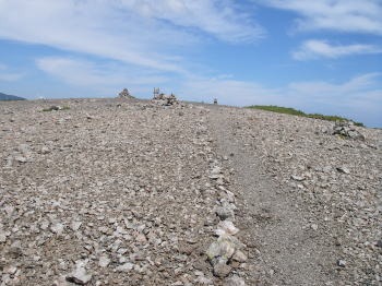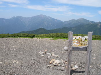 | この日も晴天で、南岳に着いたときには強い日差しを感じ、前日の轍を踏まないように日焼け止めをつける。 |