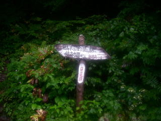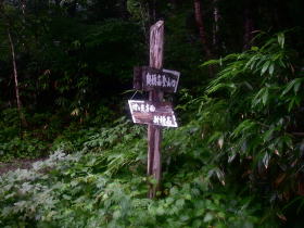 | ロープウェイ駅の脇の林道を進むと、この夏山近道という道標が現れ、近道をとる。 |