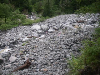 | 滝谷出合。近くに滝谷避難小屋がある。入口の戸が外れていて使い勝手は悪そう。 |