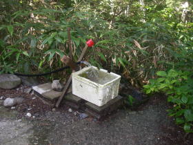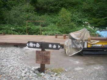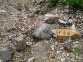 | 高平避難小屋からはまた林道歩きになり、奥穂への分岐の道標が現れる。奥穂への道にちょっと入ってみると、広場のようになっていて水場とトイレがあった。白出小屋のあった場所らしい。 |